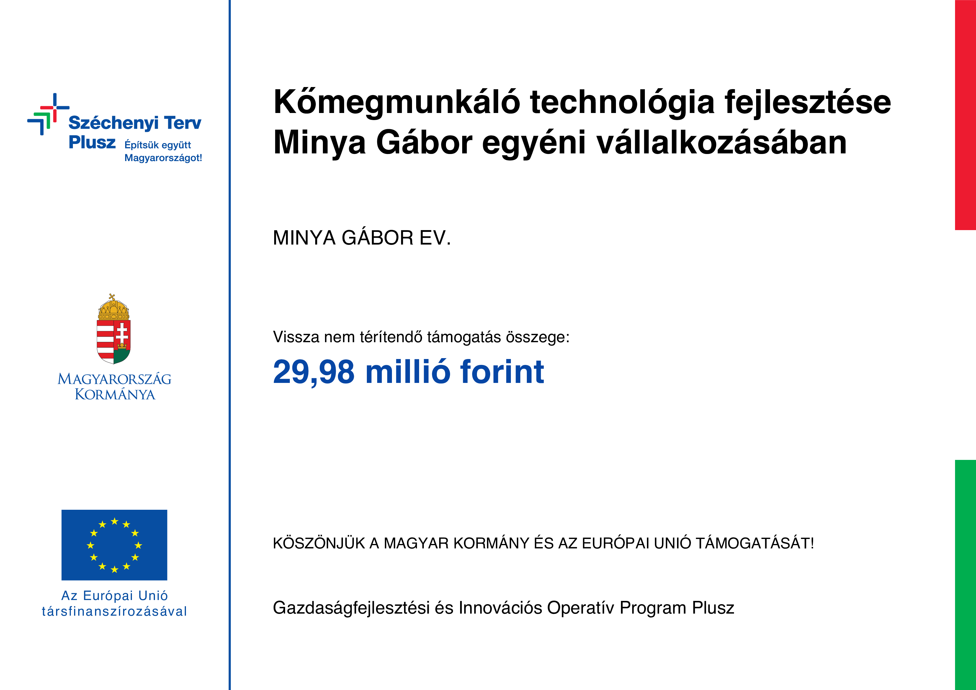 Minya Gábor egyéni vállalkozása. 29,97 millió forint vissza nem térítendő európai uniós támogatást kapott a Mikro- és kisvállalkozások támogatása a leghátrányosabb helyzetű régiókban, illetve a Szabad Vállalkozási Zónákban című, GINOP PLUSZ-1.2.4-25 azonosító számú pályázaton a Széchenyi Terv Plusz keretében. Az 59,95 millió forintos összköltségvetésű beruházásból, 50%-os támogatási intenzitás mellett a „Kőmegmunkáló technológia fejlesztése Minya Gábor egyéni vállalkozásában” című projekt valósul meg.